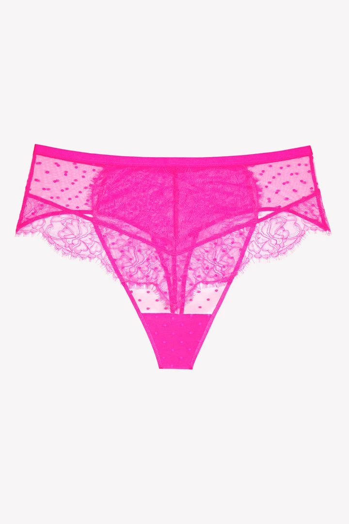 Confidence and fun have never been so easy to throw on. Our Mesh & Lace High Waisted Thong adds a little glam to your lingerie drawer – its retro look covers the tummy and hips, while keeping it flirty and minimal in the back. Strategically placed dot mesh and eyelash lace details make these panties a showstopper. Pair this lace thong with our Curvy Lace & Mesh Unlined Underwire Bra for a matching bra and panty set.