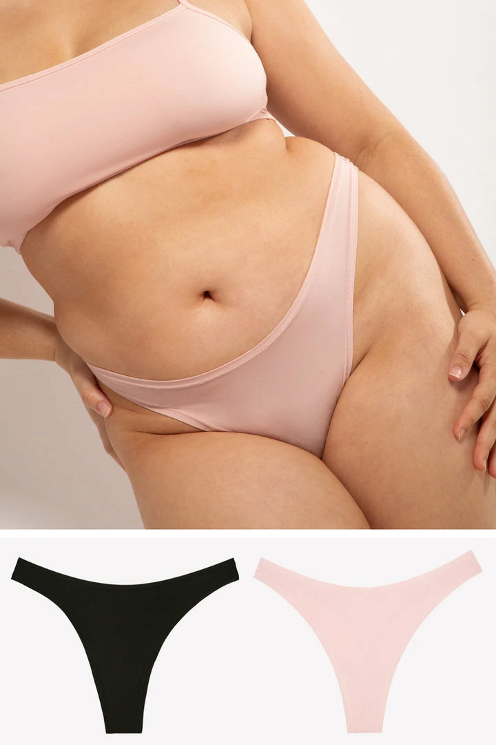 Our smoothest, most comfortable thong panties yet- The Naked Dip Front Thong 2 Pack provides next-level comfort with buttery-soft fabric that feels like a second skin. Super-stretch construction adapts to your body – never digging-in or pinching. Featuring a retro high leg cut, midrise fit, and a thong back for zero visible panty lines.
