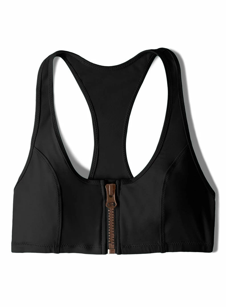 Prepare to make waves in the Zip-Up Bikini Top. Sporty looking crop top, with a sexy low cut racerback. Zipper front detail with the option to unzip a bit for customizable front cleavage. Updated retro vibes perfect for every summer destination or vacation. Complete the look with the Banded Bikini Bottom.