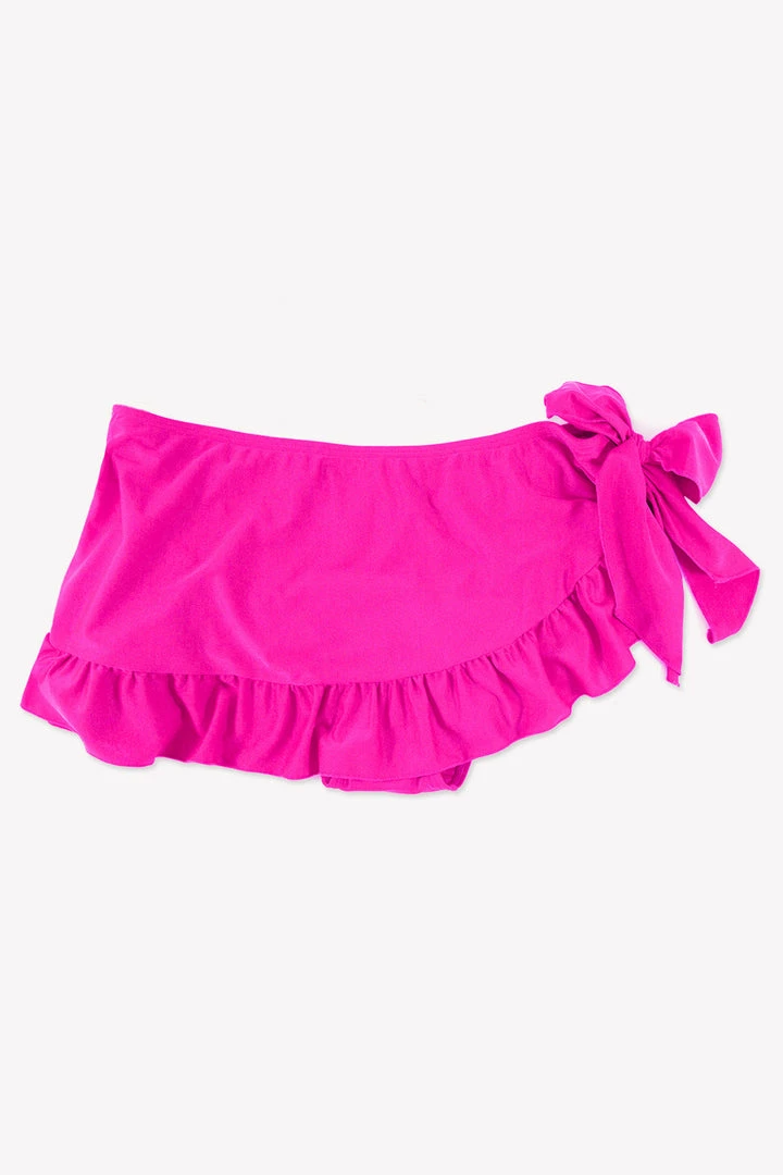 - Bikini skirt has large ruffled trim lays asymmetrical to give the look and feel of a tied beach sarong.