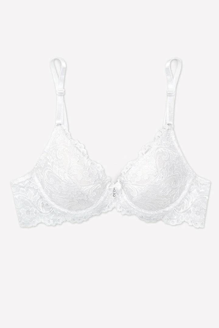 - Scalloped lace neckline and beautiful center gore bow and jewel detail make this bra perfect for everyday wear and special occasions.