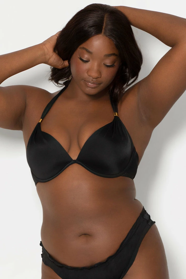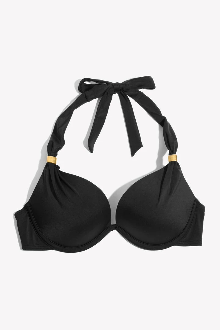 - Halter tie straps are embellished with golden hardware and tie behind the neck for additional lift.