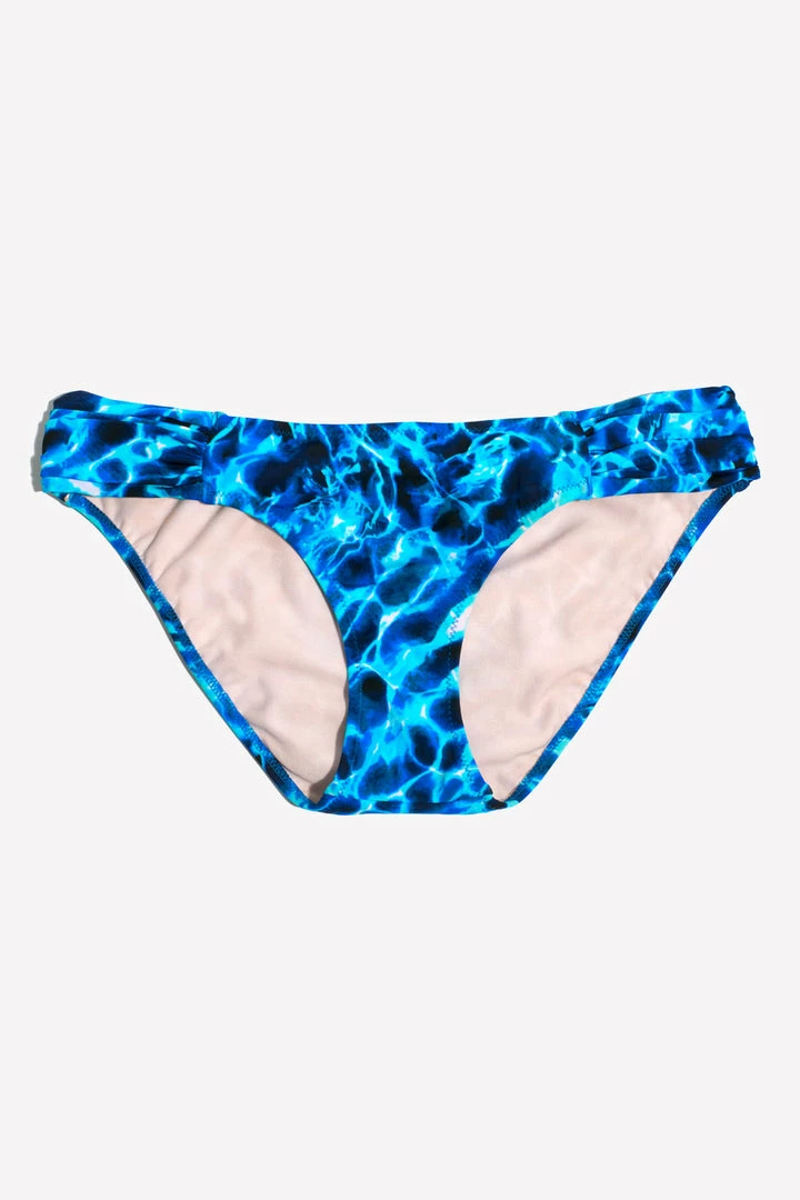 - Low rise bikini bottom sits right on your hips with side ruched waistband detailing and a gold plate at the back creates a beautiful silhouette.