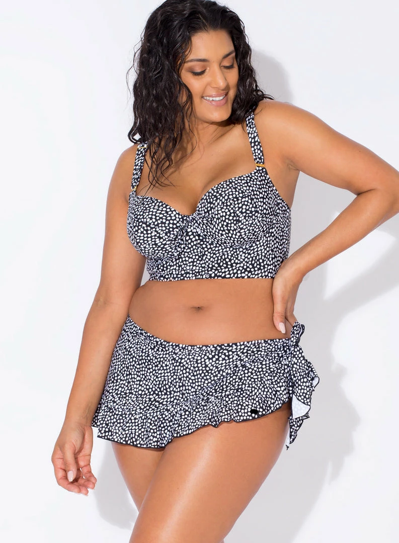 - Bikini skirt has large ruffled trim lays asymmetrical to give the look and feel of a tied beach sarong.