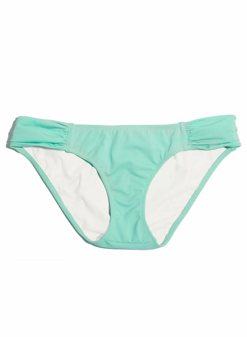- Low rise bikini bottom sits right on your hips with side ruched waistband detailing and a gold plate at the back creates a beautiful silhouette.