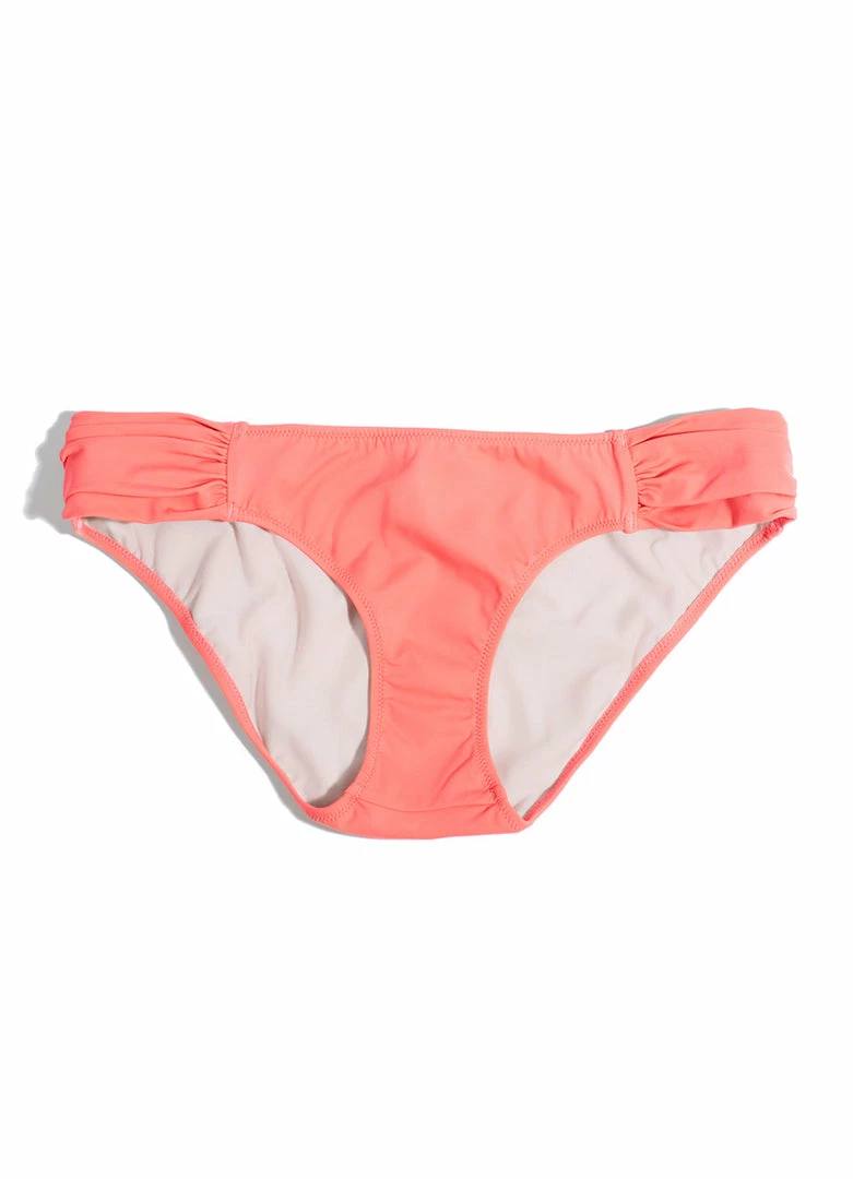 - Low rise bikini bottom sits right on your hips with side ruched waistband detailing and a gold plate at the back creates a beautiful silhouette.